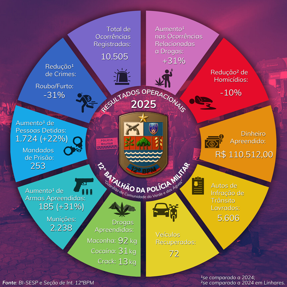 O 12º Batalhão da Polícia Militar em Linhares apresentou o balanço dos resultados operacionais alcançados ao longo do ano de 2025. Os dados demonstram avanços significativos nas ações de repressão qualificada, prevenção criminal e segurança viária nos municípios sob responsabilidade da Unidade.