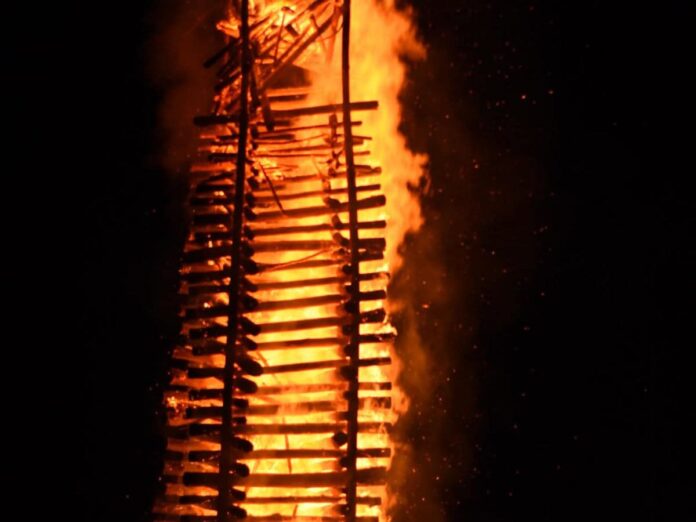 Milhares de pessoas que participaram da 1ª Festa de São João de Marilândia, na noite de sábado (21), assistiram à queima de uma fogueira gigante. Com cerca de 27 metros de altura, a estrutura foi montada pela primeira vez na cidade e se tornou a grande atração do evento, realizado no espaço cultural Giordano Lorencini.