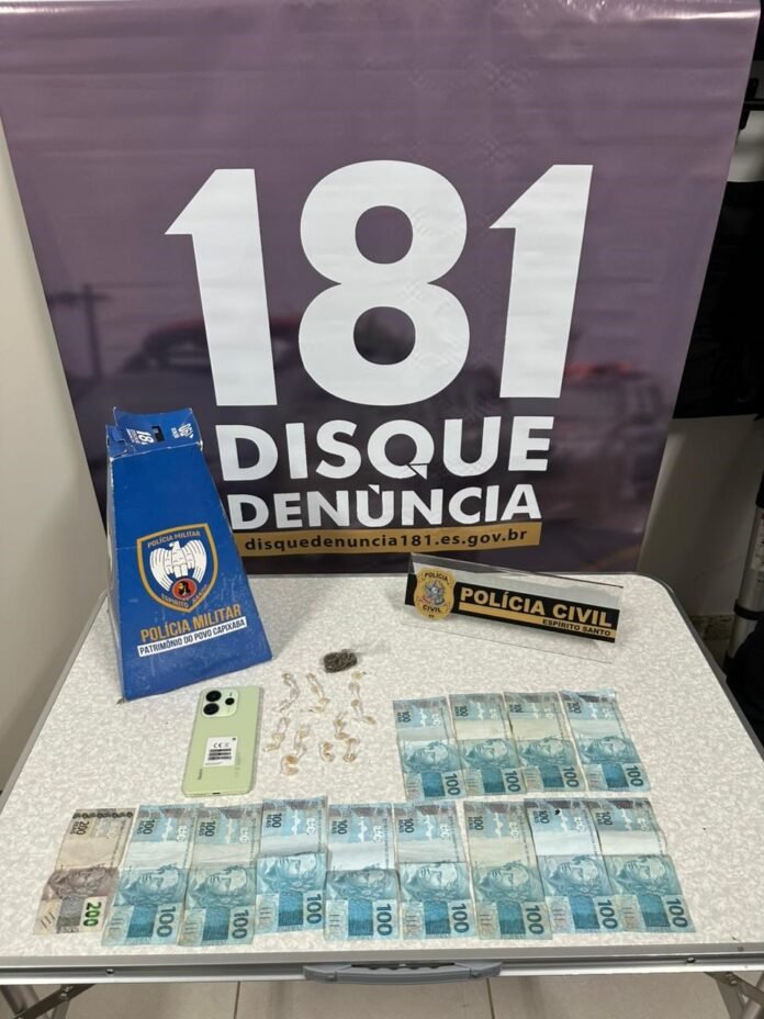 Com o apoio da cadela Athena, da equipe K9 da PMES, foram realizadas buscas no local, sendo apreendidas 25 pedras de crack já embaladas para comercialização, uma bucha de maconha, R$ 1.400,00 em espécie, além de uma jaqueta preta, identificada como a mesma utilizada em recentes roubos e tentativas de homicídio na região.