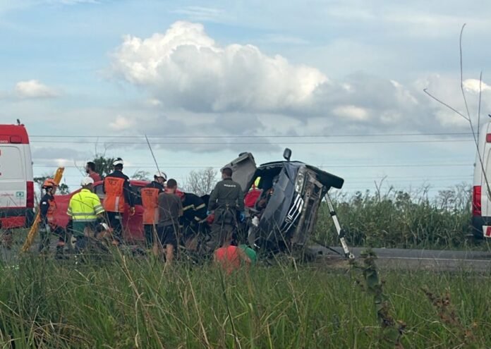 A colisão ocorreu no km 181,7, por volta das 14h25, e envolveu um Honda City, que ficou parcialmente tombado sobre um Volkswagen Voyage, além de uma carreta, segundo a Polícia Rodoviária Federal (PRF).