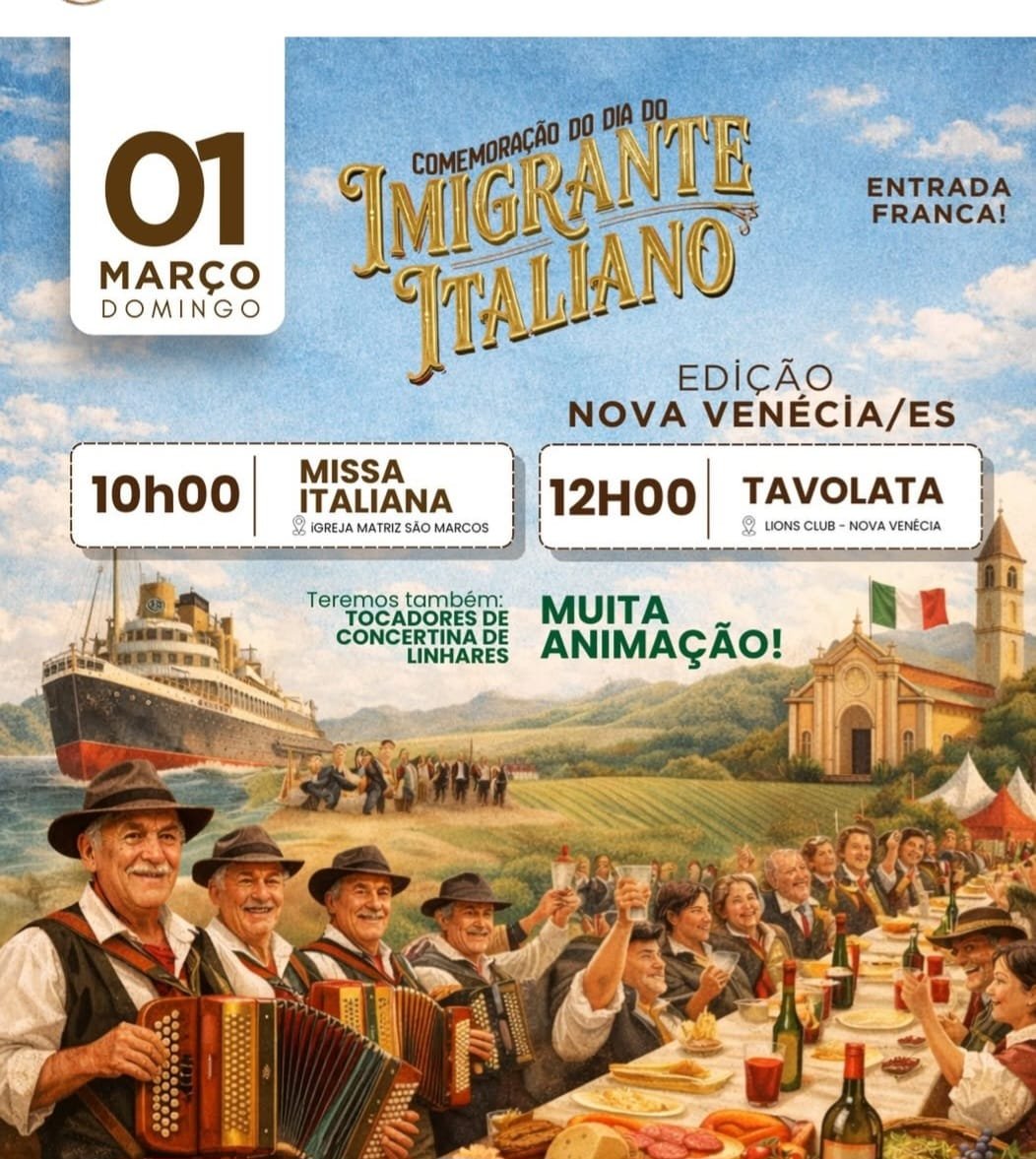 Emoção, união e confraternização prometem marcar a 9ª edição da Comemoração do Dia Nacional do Imigrante Italiano, que será realizada na Igreja Matriz de São Marcos e no Lions Clube de Nova Venécia, neste domingo (01).