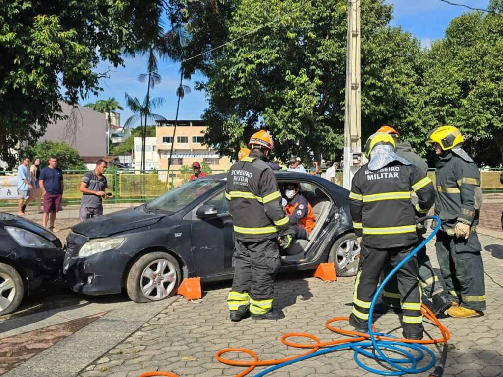 Realizado na Praça Adélio Lubiana, o evento contou com exposição de equipamentos operacionais, simulação de resgate veicular e orientações sobre primeiros socorros. A programação também incluiu medição gratuita de pressão arterial e glicemia, além de uma demonstração prática sobre os riscos do “ponto cego” em veículos de grande porte.
