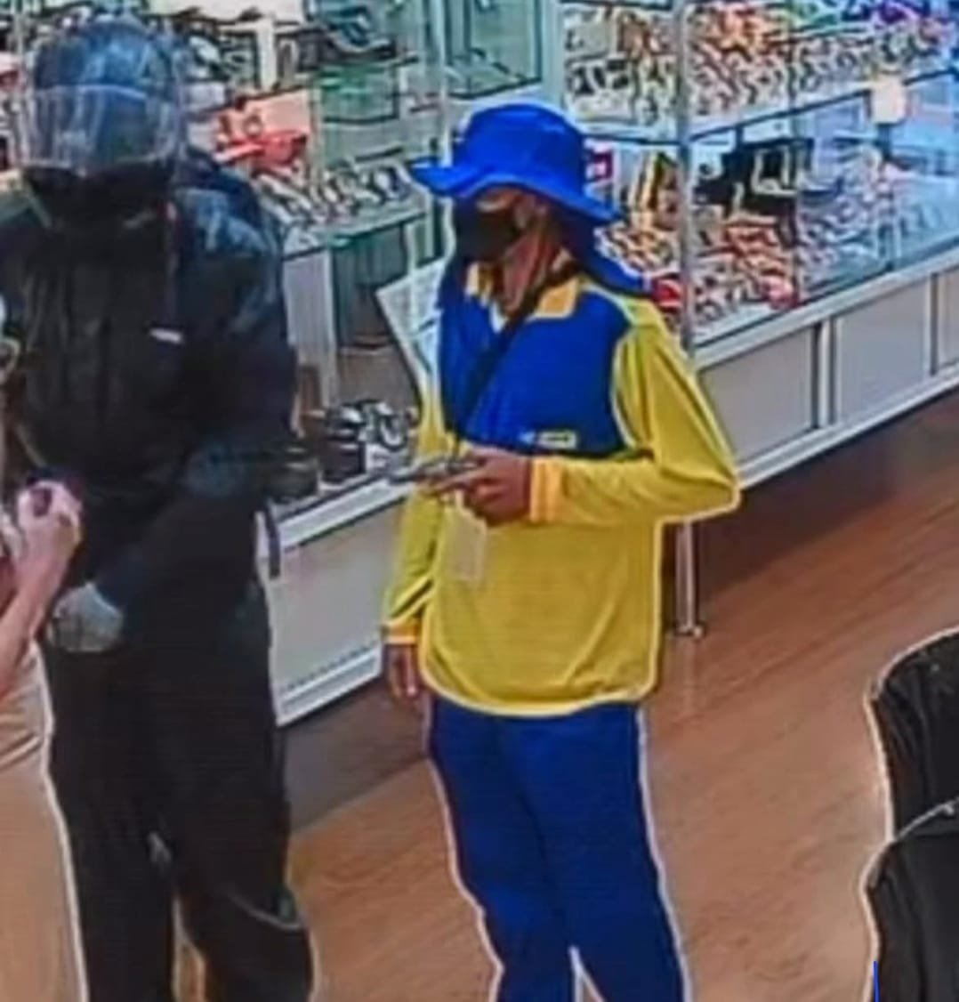 O registro policial indica que a dupla entrou no estabelecimento por volta do meio-dia. O suspeito com vestes parecidas com a de um carteiro, que também usava um chapéu, apontou a arma para uma pessoa presente e anunciou o assalto, mandando que ela se dirigisse ao fundo da loja. O segundo criminoso, de capacete e capa de chuva, também empunhava uma arma.