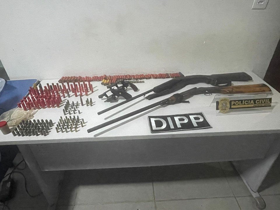 Durante a abordagem, o suspeito informou haver armamento no interior do imóvel. Na busca domiciliar, foram apreendidos dois revólveres, duas espingardas e 154 munições de diferentes calibres, inclusive de uso restrito, como .45 e 7.62.