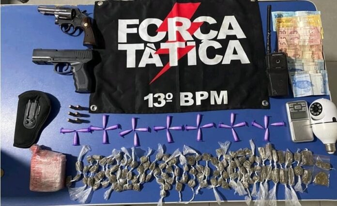 Durante a ação, foram encontrados 27 pinos de cocaína, 106 buchas de maconha (cerca de 401g), um tablete de 203g da mesma droga, um revólver calibre .38 municiado, um simulacro de pistola, balança de precisão, rádio comunicador e câmera de monitoramento. Uma mulher tentou omitir informações, mas acabou presa.