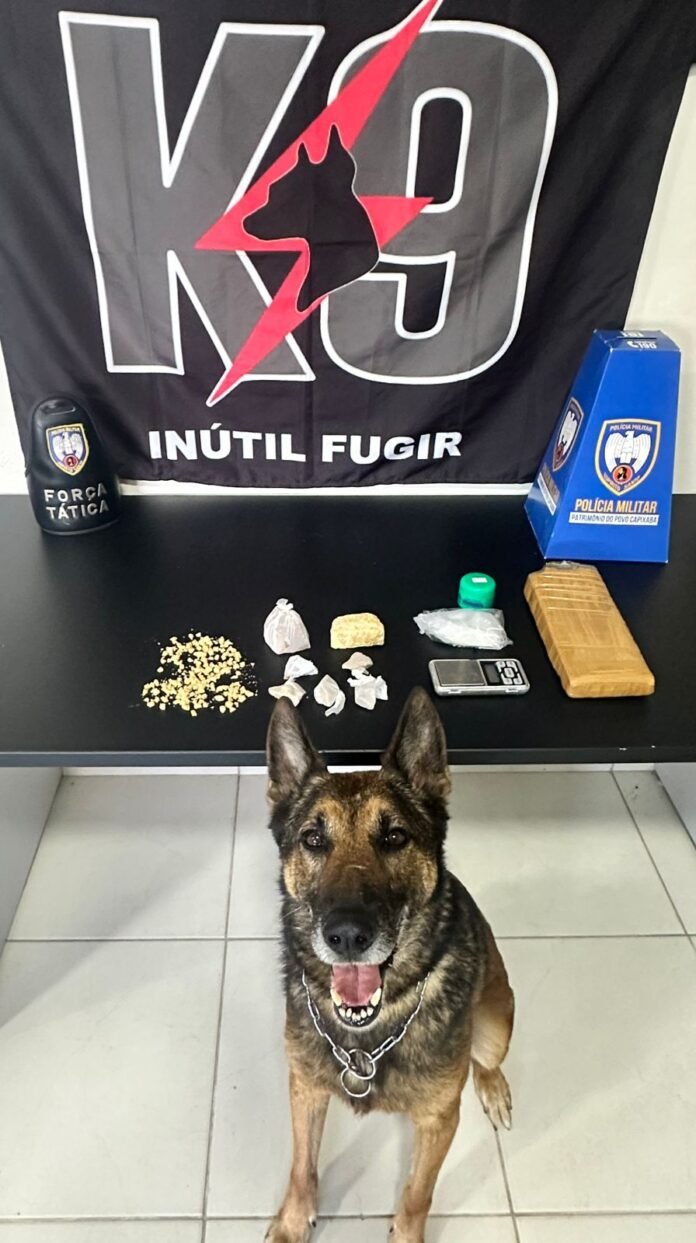 Durante as buscas, o cão policial sinalizou três pontos distintos, onde foram encontrados os materiais ilícitos.