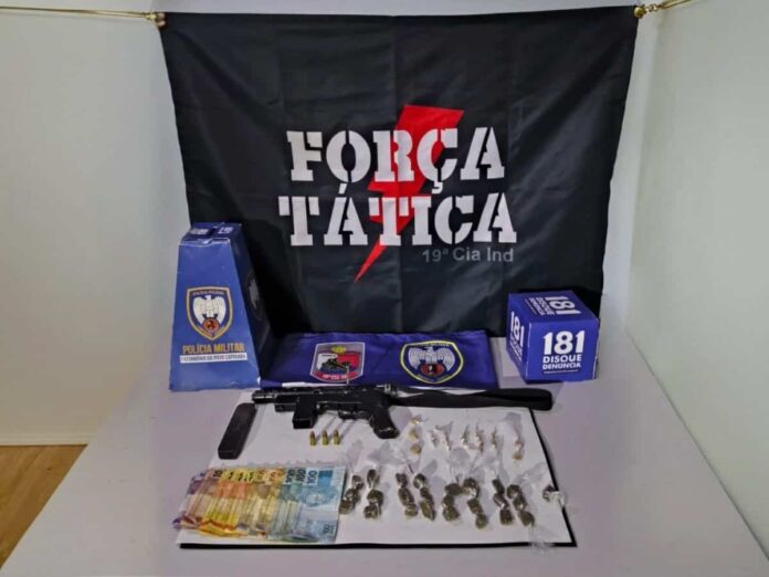 Com o suspeito, foi encontrada uma submetralhadora artesanal calibre 9mm carregada com três munições. Os policiais também apreenderam 20 pedras de crack e 25 buchas de maconha, ambas já embaladas para venda, além de R$ 874,00 em espécie.