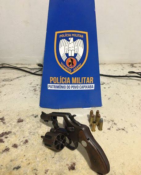 Durante a ação, os policiais localizaram um revólver calibre 32, municiado com cinco cartuchos, em sua cintura.