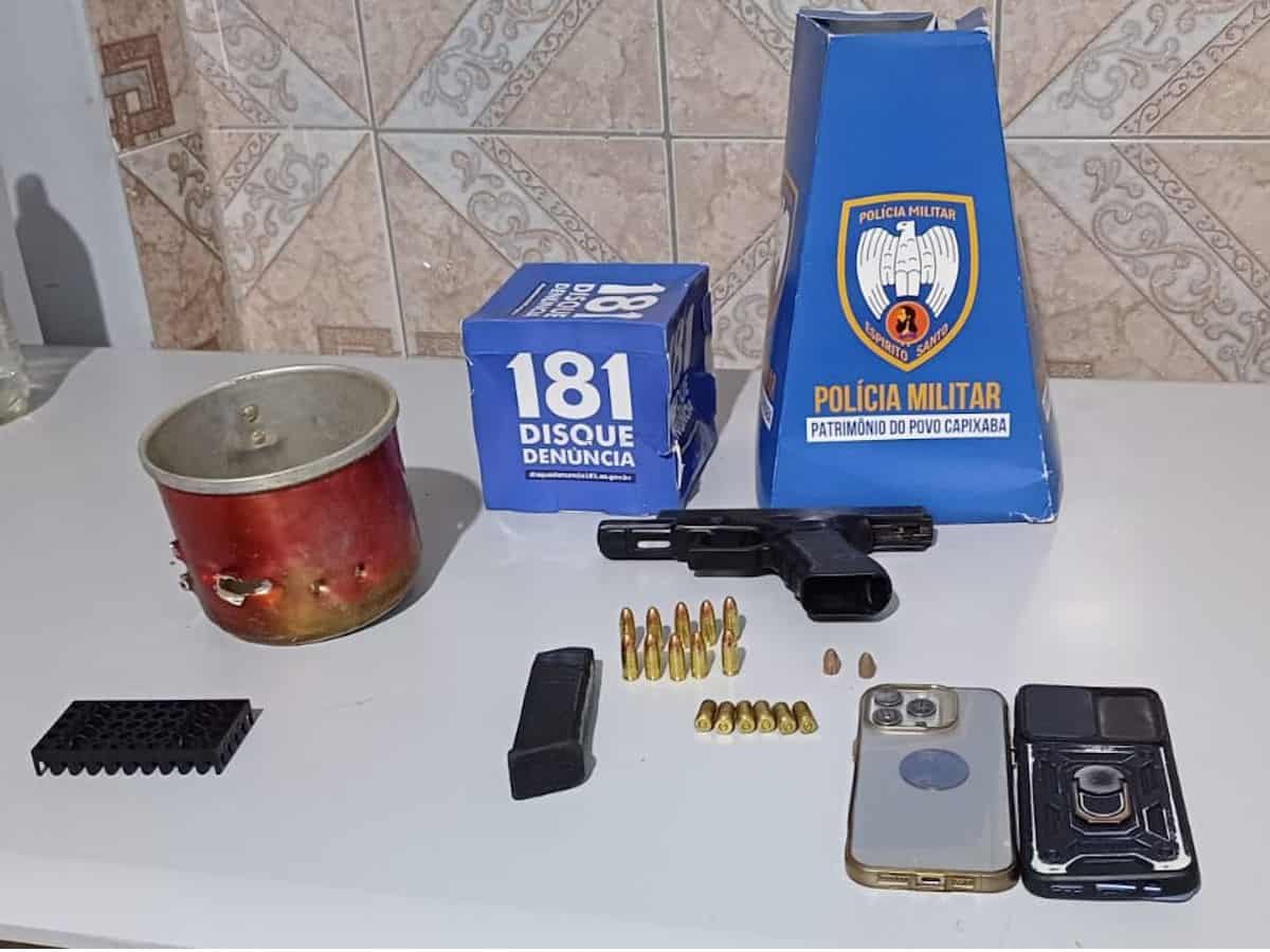Segundo a Polícia Militar, dois suspeitos e uma criança estavam dentro de um veículo VW Golf, cor prata, com película escura nas janelas. Durante uma vistoria veicular, os policiais encontraram, no assoalho de trás, uma pistola Glock, calibre 9 mm, com numeração raspada, além de 10 munições intactas e duas já deflagradas. Também foi encontrado um caneco de alumínio com várias perfurações.