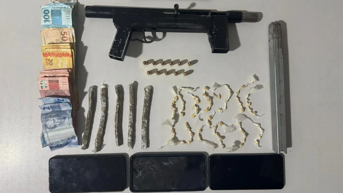 Na sequência, os policiais realizaram uma busca na casa do idoso, onde apreenderam uma submetralhadora calibre 380 com 11 munições, além de mais drogas, incluindo crack e maconha. O avô foi localizado nas proximidades da residência, com R$ 1.414 em dinheiro e pedras de crack.