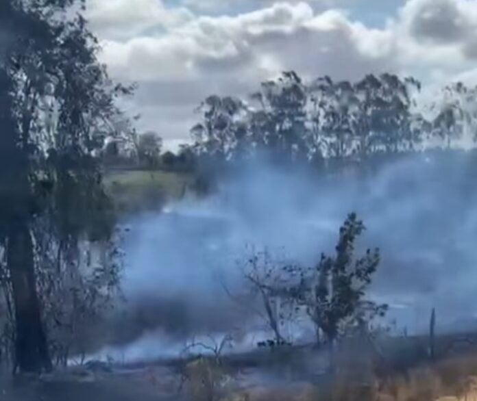 Com o vento forte e a vegetação seca, as chamas se alastraram rapidamente, atingindo uma área de mata e ameaçando propriedades vizinhas.