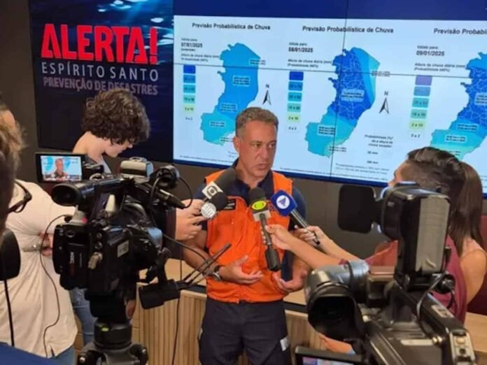 O Instituto Nacional de Meteorologia (Inmet) emitiu, nesta terça-feira (10), um alerta laranja para 47 municípios do Espírito Santo, devido à previsão de chuvas intensas, com volumes entre 30 e 60 mm/h ou 50 e 100 mm/dia, além de ventos fortes, com velocidades variando de 60 a 100 km/h.