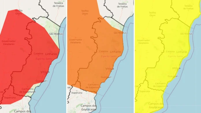 Já o alerta laranja, o segundo mais grave, afeta 77 cidades do estado (exceto Pedro Canário) e também segue até o fim do dia. A previsão é de chuvas de até 100 mm, com ventos que podem atingir de 60 a 100 km/h, com risco de alagamentos.
