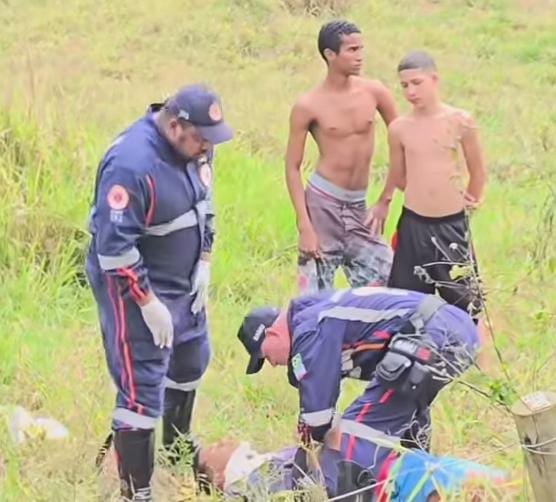 Um motociclista, que seguia em alta velocidade, perdeu o controle da direção e foi arremessado para fora da pista.Por coincidência, uma equipe do SAMU passava pelo local no momento.