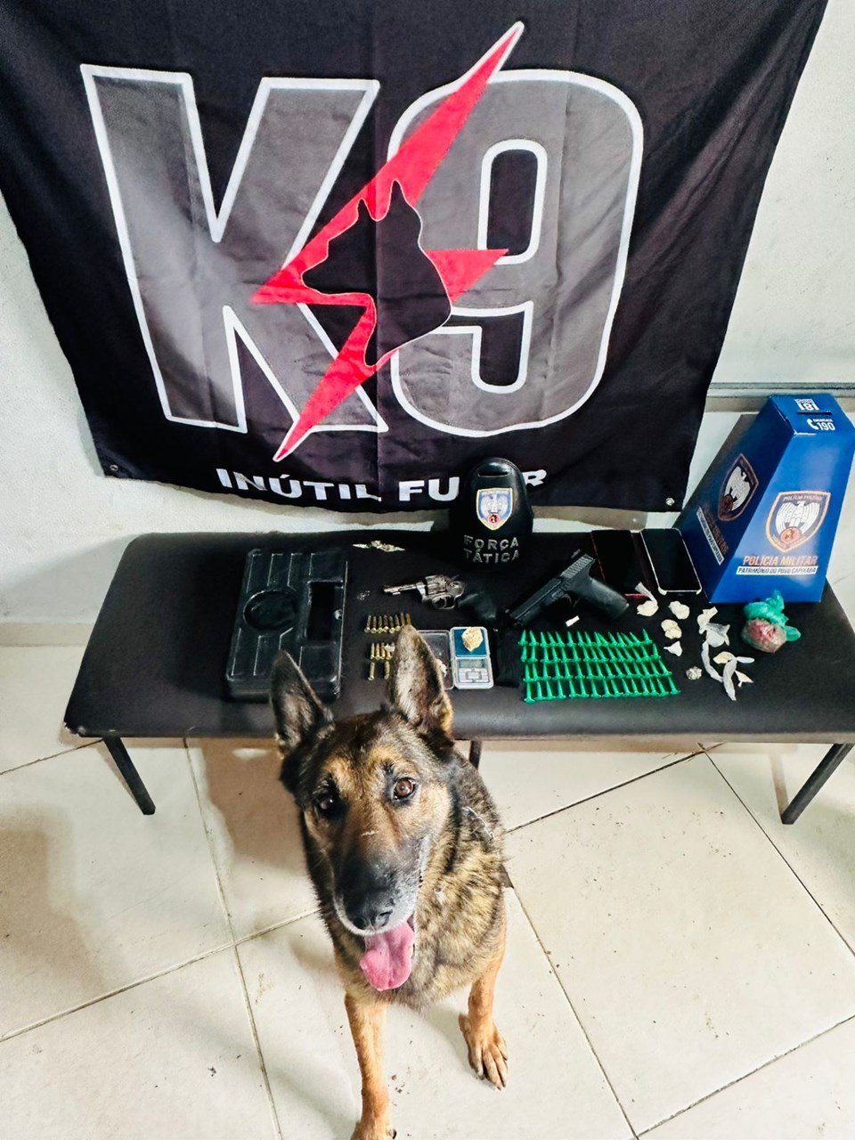 Durante a ação policial três pessoas foram detidas e os seguintes materiais foram apreendidos: 01 revolver Taurus calibre .32; 01 espingarda calibre.22; 01 garrucha calibre.22; 01 pistola simulacro; 13 munições calibres .32 e .38; 60 pinos de cocaína; papelotes e pedras de crack; bucha de maconha; cápsulas e carregadores; balança de precisão; 02 celulares, além de outros materiais de procedência ilícita.