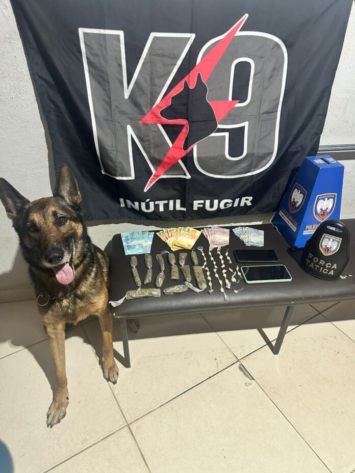 Durante a abordagem, as autoridades encontraram com os suspeitos 32 pedras de crack, 14 tiras de maconha, dois celulares e um total de R$ 1.480,00 em dinheiro. O cão farejador “Rex” foi fundamental para localizar os entorpecentes escondidos no pasto e nas proximidades da residência.