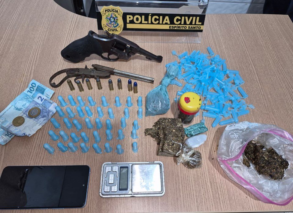 Durante a entrada na residência do investigado, os policiais apreenderam um revólver calibre .38 com numeração suprimida, uma garrucha, 40 pinos de cocaína, aproximadamente 200 gramas de maconha, uma balança de precisão e centenas de pinos vazios utilizados para o acondicionamento de entorpecentes destinados à comercialização.