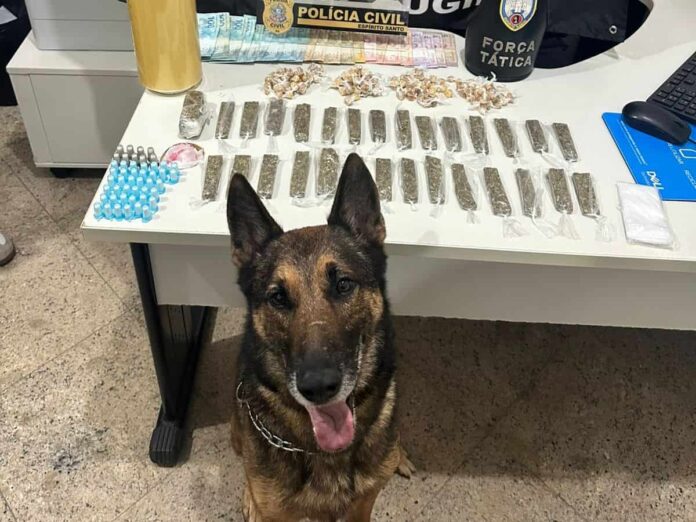 De posse de um mandado de busca e apreensão, as equipes se dirigiram à residência do suspeito principal, identificado como E.R.A. Embora ele tenha conseguido fugir antes da chegada da polícia, os agentes realizaram buscas no imóvel com ajuda do K9, onde encontraram 156 pedras de crack, 47 pinos de cocaína, 38 buchas de maconha, R$ 1.170,00 em espécie e diversos materiais para embalo de drogas.