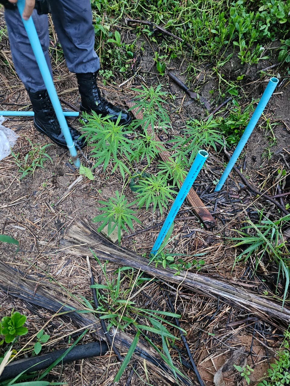 Ao verificarem a área de mata indicada, os agentes localizaram um pé de cannabis em estágio de maturação, com sinais de cultivo recente e manejo diário. O local apresentava demarcações que indicavam plantio contínuo.
