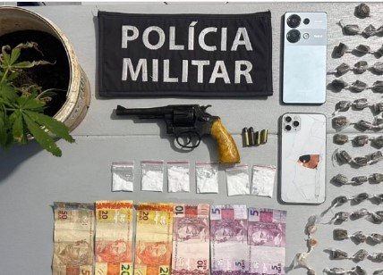 Durante as buscas no trajeto percorrido pelos suspeitos, os policiais encontraram um revólver calibre .32 com munições, além de 43 buchas de maconha, quatro pedras de crack, seis papelotes de cocaína, R$ 110 em espécie e dois aparelhos celulares. Nas proximidades, foi também localizada uma planta de maconha cultivada em um vaso, escondida sob uma árvore.