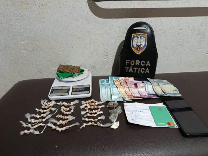Ao recuperarem o material descartado, os policiais encontraram uma grande quantidade de entorpecentes e itens relacionados ao tráfico. Foram apreendidas 99 pedras de crack, um pedaço e duas buchas de maconha, um papelote de cocaína, uma balança de precisão e uma folha com anotações da contabilidade do tráfico. Além disso, foram encontrados R$ 376,00 em dinheiro, um celular e um cartão bancário.