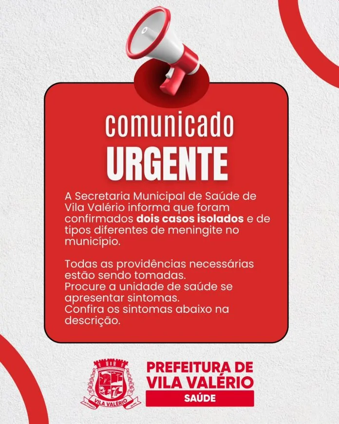 A Prefeitura de Vila Valério, no Espírito Santo, divulgou um comunicado nesta segunda-feira (13) confirmando dois casos de meningite na cidade, ambos de tipos diferentes. Embora o município não tenha fornecido detalhes sobre os pacientes, assegurou que “todas as medidas necessárias estão sendo tomadas” para conter a propagação da doença.