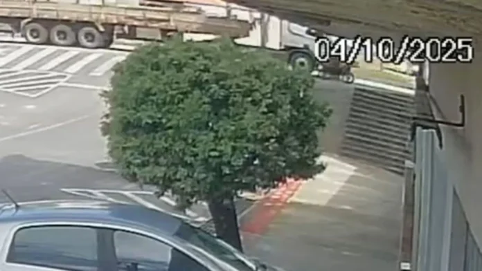 A motocicleta chegou a um cruzamento e entrou na pista da rodovia. A carreta, que trafegava no mesmo instante, colidiu com a lateral da moto.